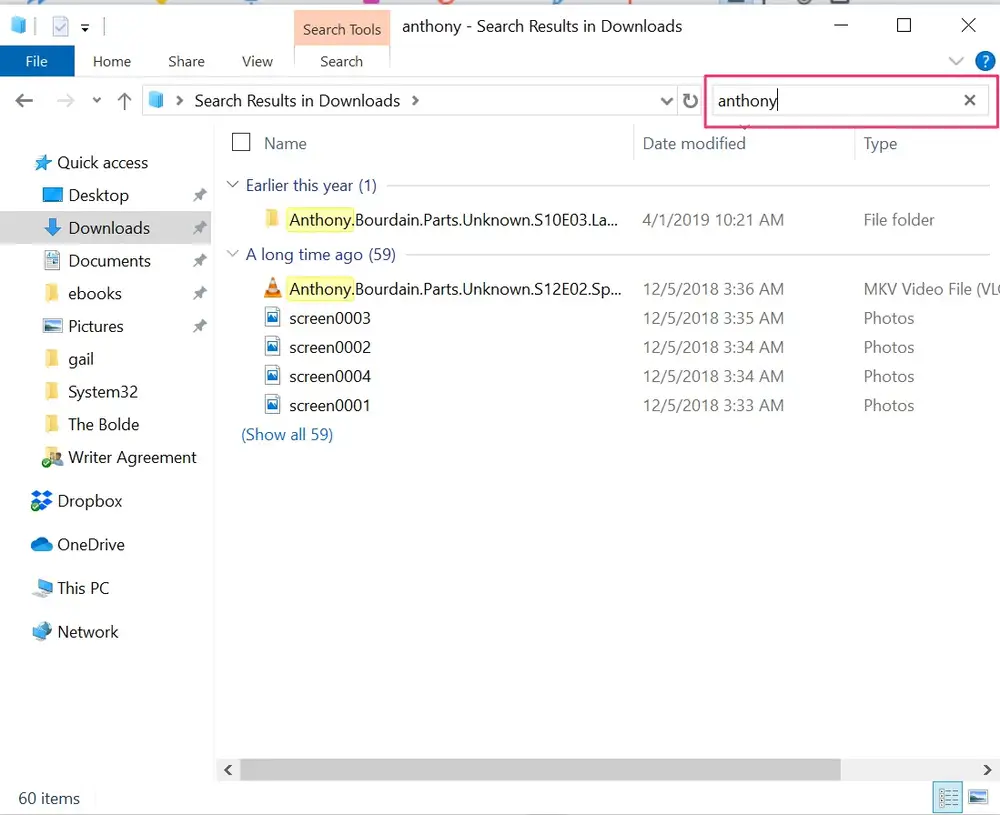 Search looks in all folders and subfolders within the library or folder you’re viewing. When you tap or click inside the search box, the Search Tools tab appears. As you enter your search terms, your results will start to appear with your search terms highlighted.
